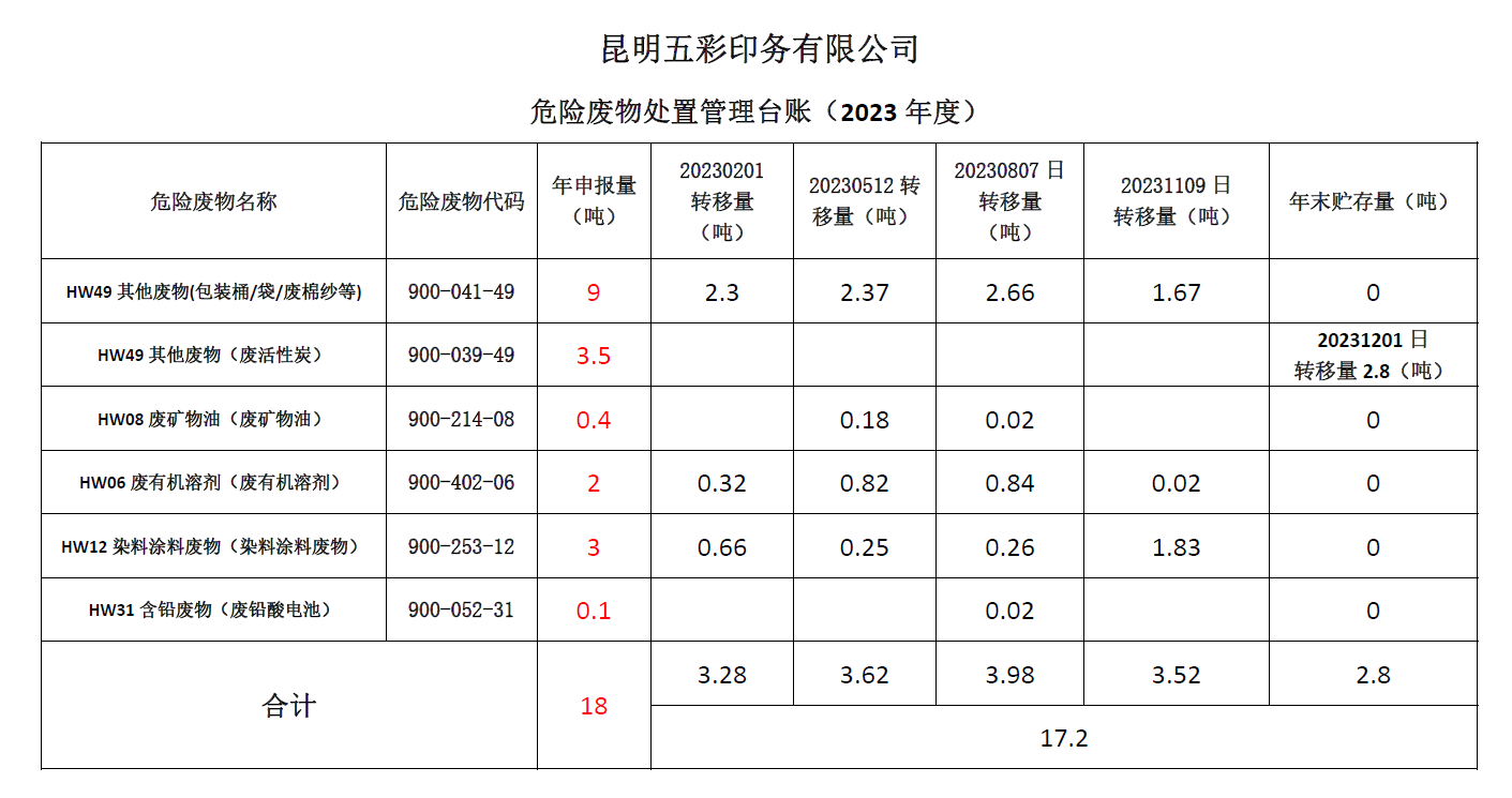 【公示】昆明五彩印務有限公司——2023年度危險廢物處置臺帳